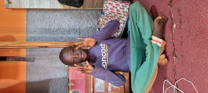 In Bukuru, Nigeria, an indoor scene displays a young child of African descent seated cross-legged on a reddish-brown patterned rug