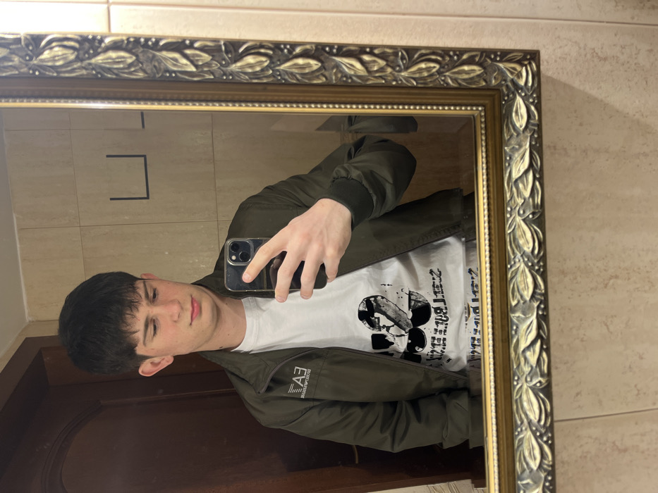 A young male is depicted from the upper chest upward, taking a mirror selfie in an indoor setting. He has short, dark hair and light skin, and is looking slightly downward and to his left (his right in the reflection). He wears a dark olive green zippered jacket with a visible "EA7 EMPORIO ARMANI" logo on the left chest, over a white t-shirt featuring a partially obscured, inverted black and white graphic design. His right hand (appearing as his left in the reflection) holds a dark-colored smartphone, likely an iPhone with three camera lenses, positioned to capture the reflection. The mirror features an ornate, gold-colored frame with a raised leaf-and-berry pattern. The background, visible in the mirror's reflection, consists of light beige or cream-colored tiled walls with visible grout lines. To the left of the individual's head in the reflection, a dark wooden door with paneling is visible. To the right of his head, a dark, U-shaped fixture or marking is present on the tiled wall. The general environment is an interior space, likely a room with artificial lighting. The image does not contain specific visual indicators to identify its precise location within Ruse, Bulgaria.