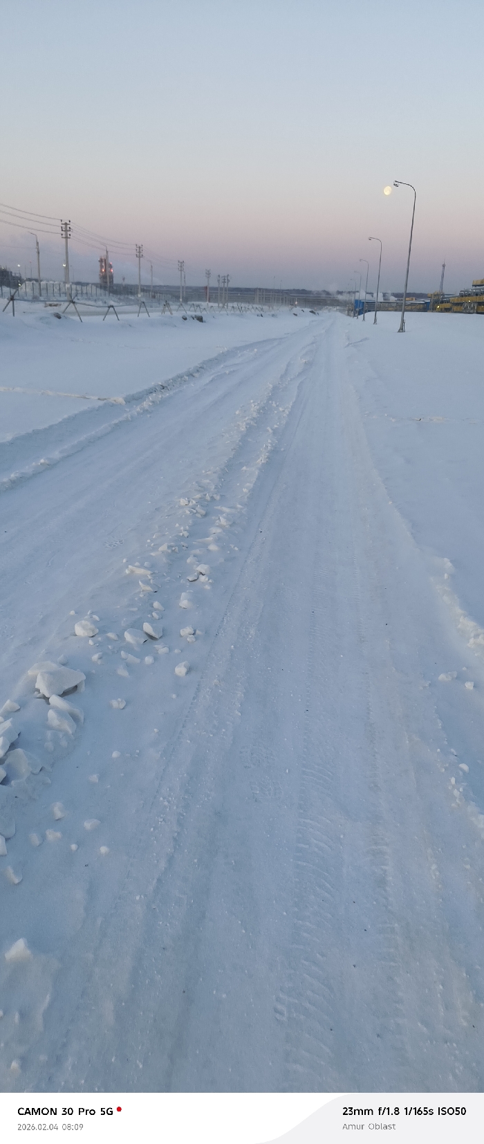 A desolate, snow-covered road stretches into the distance under a pale dawn sky. Tire tracks mark the center, flanked by icy mounds. Overhead, streetlights illuminate the scene, while power lines and industrial structures fade into the horizon. The camera settings at the bottom read "CAMON 30 Pro 5G", "2026.02.04 08:09", "23mm f/1.8 1/165s ISO50", and "Amur Oblast".