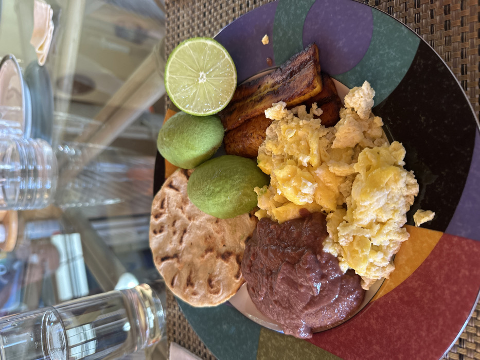 The image displays a meal set on a table, observed from a slightly elevated perspective, likely within a dining area in San Salvador, El Salvador