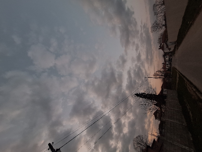 The image displays a residential street scene in the city of Dolni Chiflik, Bulgaria, under an overcast sky at what appears to be late afternoon or early evening. The upper two-thirds of the frame are dominated by a dense formation of grey and white clouds, with faint patches of pale blue visible and subtle orange-pink hues near the horizon line. A narrow, unlined paved road extends into the distance, occupying the lower center of the photograph. On the left side of the road, a tall, segmented concrete block wall runs parallel to the street, behind which are several houses with sloped roofs and bare deciduous trees. A prominent wooden utility pole stands in the foreground on the left, supporting multiple dark electrical lines that traverse horizontally across the mid-ground. A tall, dark, bare coniferous tree is positioned centrally behind the concrete wall. On the right side of the road, a lighter-colored wall or fence is visible, beyond which more residential structures and bare trees are present. The ground immediately adjacent to the road features sparse, dark vegetation. No individuals or vehicles are visible in the scene.