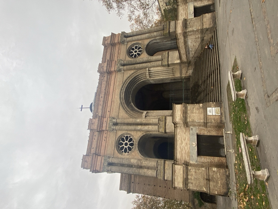 The image displays the Grand Temple de Toulouse, a Protestant church located at Rue Vélane, Toulouse, France, under an overcast sky. The building's facade is primarily constructed from light brown and reddish-brown brickwork. It features a central, large arched entrance accessible via a wide set of dark stone steps, and two smaller, recessed arched entrances on either side. All three archways are secured by dark metal gates. Above the two side arches are prominent circular rose windows with detailed tracery. Four tall columns with ornate capitals flank the main entrance and the side sections. A simple cross finial is mounted on the roofline above the central arch. At ground level, below the main staircase, two smaller, dark wooden doors are visible on either side. A small decorative emblem is positioned above the left wooden door, and two informational plaques are affixed to the brick wall to its right. A single individual, dressed in dark clothing, is seated on one of the lower steps of the main staircase on the right side, looking downwards. The foreground consists of a paved area, likely asphalt or cobblestones, interspersed with patches of green grass and scattered dry leaves, indicative of autumn or winter. Three light-colored stone benches are positioned on this paved surface. Deciduous trees with minimal foliage are visible on the left and right edges of the frame, partially obscured by the building. The overall lighting is diffused and even, consistent with cloudy conditions.