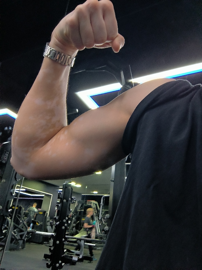 A close-up, low-angle photograph depicts a person's flexed right arm, showcasing the bicep. The arm's skin displays numerous irregular, hypopigmented patches, primarily on the inner forearm and bicep. A silver-colored metal link watch is worn on the wrist. A portion of a black t-shirt sleeve covers the upper right shoulder area. The background is a reflection in a large mirror, revealing the interior of a modern fitness center, consistent with gyms found in cities such as Sofia, Bulgaria. The gym features dark walls and ceiling, illuminated by linear LED lighting elements that emit white and blue light, some arranged in angular patterns. Several pieces of gym equipment are visible in the reflection, including weight machines, benches, and a black vertical rack designed for weight plates. Two other individuals are present in the reflected background: a male in a dark top near equipment on the left, and a blonde-haired female in dark athletic wear standing further back on the right. A partial logo, "SBO B," is discernible on equipment in the reflection.