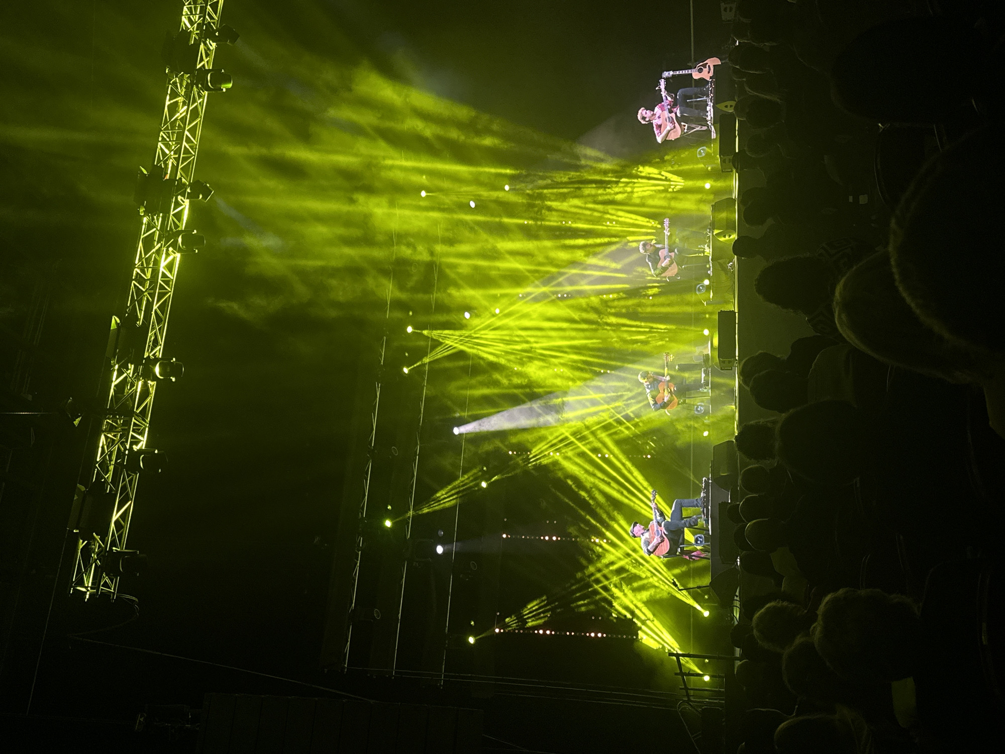 An indoor concert venue in Riga, Latvia, is depicted from a seated audience perspective. The image focuses on a brightly illuminated stage where four male performers are seated, each playing an acoustic guitar. The performers are positioned centrally on the stage, with microphones in front of them and floor monitors at their feet. One additional acoustic guitar rests on a stand on the far right of the stage. Overhead, multiple truss structures support an array of stage lighting, emitting strong yellow-green light beams through atmospheric haze. Vertical light strips are visible on the stage backdrop, and a large speaker line array is suspended from rigging on the stage's left. The foreground shows the silhouetted heads and shoulders of audience members, seated and facing the stage.