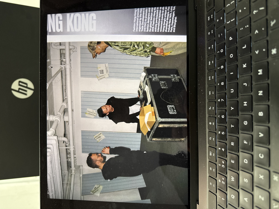 A photo of a magazine page showcasing "HONG KONG" fashion. The page features a scene with three individuals. One wears a green jacket and appears to be passing a banana to someone. Another stands next to a black equipment case and a box. The third person is seen with a drink. The backdrop is a room with exposed piping. Text on the page describes Fashion Hong Kong, international promotions, and trade development. A black laptop and HP box frame the picture.