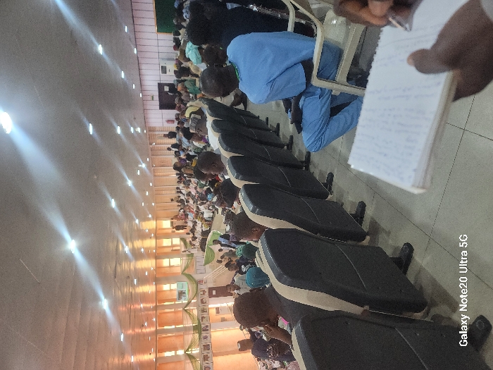 The image depicts an indoor scene within a large, brightly lit hall or auditorium in Vom, Nigeria
