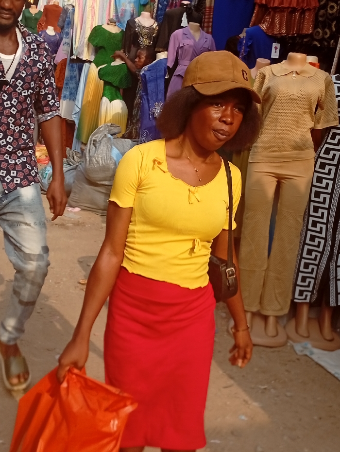 This image shows an outdoor market in the city of Nkwelle, Nigeria. In the foreground, a dark-skinned woman is positioned, wearing a yellow ribbed short-sleeved top, a red knee-length skirt, and a brown baseball cap with a light-colored 'C' insignia on the front. She holds an orange plastic bag in her right hand and carries a black shoulder bag on her left side. She looks towards the camera with a neutral expression. To her left, partially cropped, a dark-skinned man walks, clad in a long-sleeved patterned shirt (dark with white and reddish-brown motifs), light blue jeans, and olive-green sandals. A beaded necklace is visible on his chest. The background displays multiple market stalls with various garments on mannequins and hangers, including a green dress, purple and blue tops, and a tan knitted top with matching pants. One individual is partially visible behind a mannequin displaying a green dress. The ground is unpaved, appearing as compacted earth, with several gray bags clustered near the market stalls.