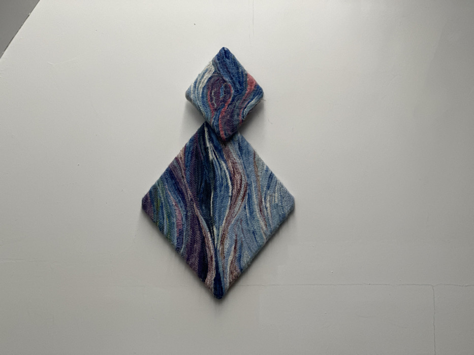 The scene is situated in Taoyuan City, Taiwan, depicting an indoor environment. Two textile art pieces are mounted on a plain, light-colored wall with minor surface imperfections. The larger piece, positioned to the left, is a diamond-shaped textile featuring swirling, wave-like patterns in various shades of blue, purple, pink, and hints of green and white. Its surface is visibly textured. A smaller, similarly diamond-shaped textile piece is positioned to the right of the larger one, slightly overlapping its right edge and situated marginally lower. This smaller piece exhibits analogous swirling patterns and a comparable color palette of blues, pinks, purples, and white. No individuals, actions, or specific interactions are present in the frame.