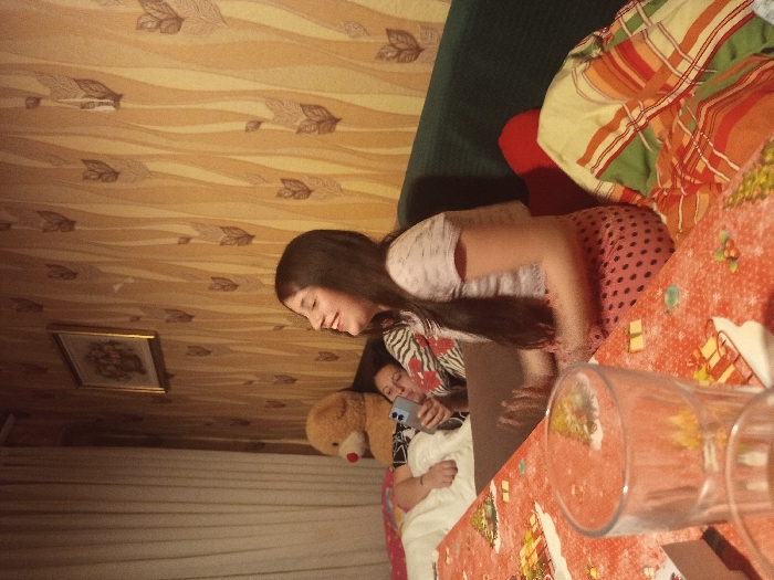 The image depicts an indoor residential setting in Roman, Bulgaria. Two females are present. On the right, a young female with long brown hair, wearing a light-colored t-shirt and pink polka-dotted pants, sits on a dark green sofa, laughing with her head tilted back and mouth open. To her left, a second female lies on a bed, visible from the torso upwards, viewing a smartphone held in her left hand. A brown teddy bear with a red nose rests upright on the bed next to her. In the immediate foreground, a table covered with a red tablecloth featuring a holiday pattern (gifts, evergreen sprigs) holds at least two clear glass tumblers. The background wall is adorned with beige wallpaper displaying a repeating pattern of dark brown leaves and wavy lines. A framed picture hangs on this wall. White curtains are partially visible on the far left. A multi-colored plaid blanket is draped on the sofa to the right of the laughing female.