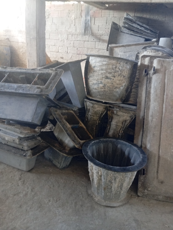 The image displays an indoor industrial or storage area in the city of Unknown, Unknown. The scene is dominated by numerous grey concrete molds and cast concrete items, appearing dusty and showing signs of wear, piled on a concrete floor. In the foreground, slightly right of center, a fluted concrete planter or mold with a black rim is visible. Behind it and to the left, various rectangular, trough-like, and curved concrete molds are stacked and scattered. The floor is a rough concrete slab, covered with a layer of dust and debris. The background features an unplastered brick wall and a vertical concrete pillar on the left. No individuals or active processes are visible within the frame.