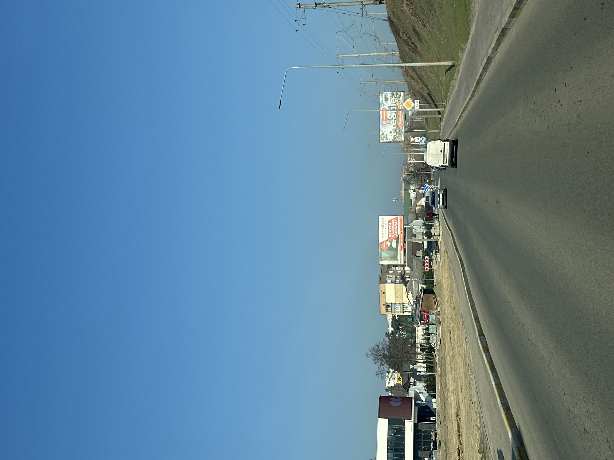 The image displays a clear daytime street scene in Irpin, Ukraine. A two-lane asphalt road, marked by yellow and white striped curbs, extends into the distance under a cloudless bright blue sky. On the left side, a section of disturbed earth, possibly a construction site, lies adjacent to a modern multi-story building with white and dark red facades. Beyond this, several additional residential or commercial buildings are visible, including one prominent yellow/beige structure. One individual, dressed in a red coat, is observed walking on a paved surface further down the road. A silver sedan travels in the opposite direction. A large billboard on this side reads "donsifon ПЛИТКА ТА САНТЕХНІКА ЛАМІНАТ" (Tiles, Plumbing, Laminate). On the right side of the road, a paved sidewalk borders a grassy embankment rising gently upwards, populated by multiple utility poles and overhead lines. A white delivery van is positioned centrally in the lane, moving away from the camera. Further down, another billboard displaying "PreSile" and a building rendering is visible, alongside a "50M" sign and other traffic signs, including a blue circular sign with a white arrow. The environment is well-lit by direct sunlight.
