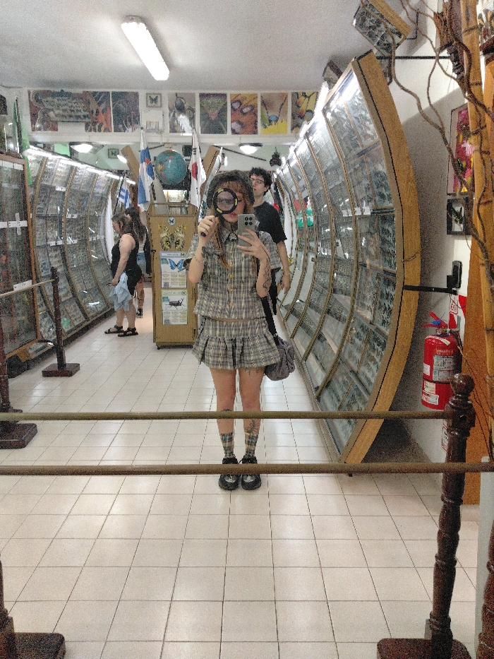 A person with a magnifying glass stands in a hallway. They wear a matching plaid skirt and top with matching socks. Other people are walking down the hallway, which is lined with glass cases. There are also some flags and other decor in the hallway. A mirror cuts through the middle of the image.