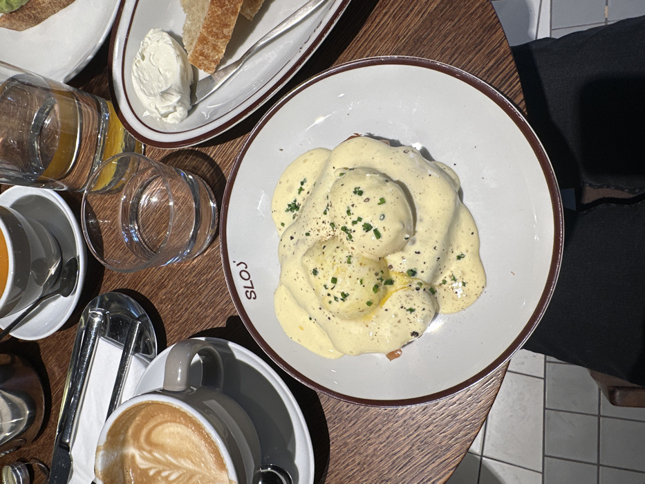 The image captures a dining table set with breakfast or brunch items, viewed from a first-person perspective