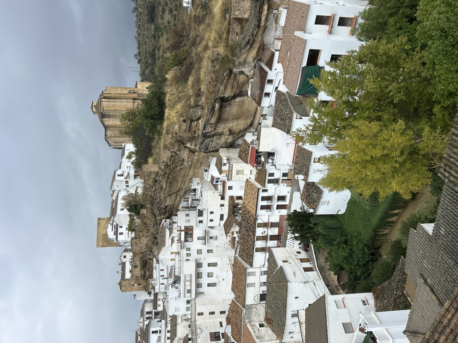 An elevated panoramic photograph captures the town of Setenil de las Bodegas, Spain, under an overcast sky