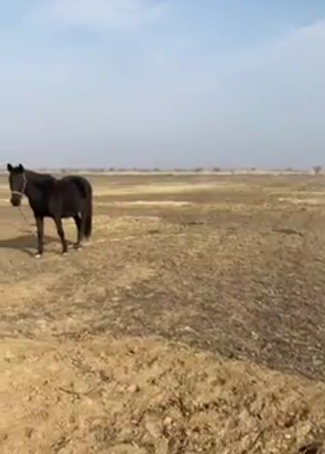dry, open field with a few horses grazing. The sky is blue, but hazy, with a line of trees visible in the distance. The ground is cracked and mostly barren, with some sparse vegetation. There are a few horses visible in the field. In the first shot, a black horse stands in the field. Then, a brown horse with a white marking on its face stands further away in the second half of the video. The camera pans across the landscape, showing the expanse of the field.