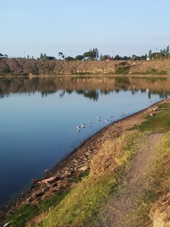 The image displays a still body of water under a clear, light blue sky, situated in Central ward, Kenya. The distant landmass is an earthy, sloped embankment topped with scattered green trees, vertical poles, and a fence line; a small red-roofed structure is visible on the far right. The water's surface distinctly mirrors the sky and the distant embankment. The near shoreline consists of a rocky edge with sparse debris, ascending to a grassy bank that includes a narrow dirt path. Approximately 15-20 small, white and dark-feathered birds are visible standing or wading along the immediate water's edge.