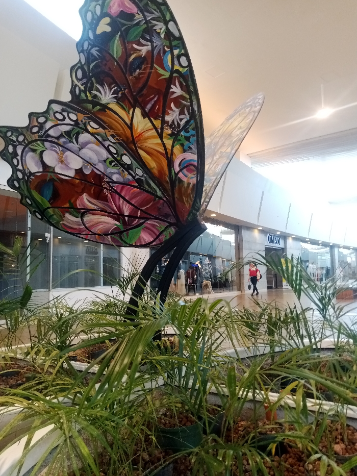 A large, colorful butterfly sculpture with floral designs dominates the foreground