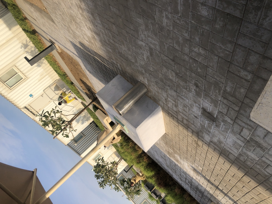 A slightly tilted image shows a concrete-paved area with a modern, boxy trash receptacle. A cylindrical, steel ashtray is mounted atop the trash bin. To the left, several structures, possibly modular buildings, feature simple windows and doors. Patches of grass and small trees line the edges of the paving. A person in a yellow shirt is visible near one of the buildings. The sky is blue in the background, hinting at a clear day.