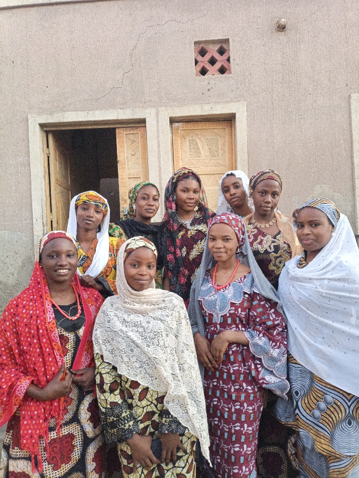 A group of eight women stands in front of a building with an open doorway and a small square window with a crisscross pattern. They are dressed in colorful, patterned fabrics and head coverings, suggesting a cultural or traditional context. Each woman is wearing a necklace, and their expressions are generally neutral. The building is a simple structure with visible cracks.