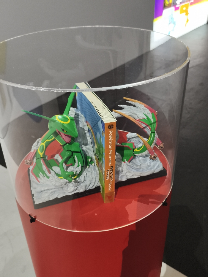 An indoor display in the city of London, United Kingdom, features a 'Pokémon Primers: Fighting Book TYPES' positioned vertically as a bookend between two green Rayquaza figures