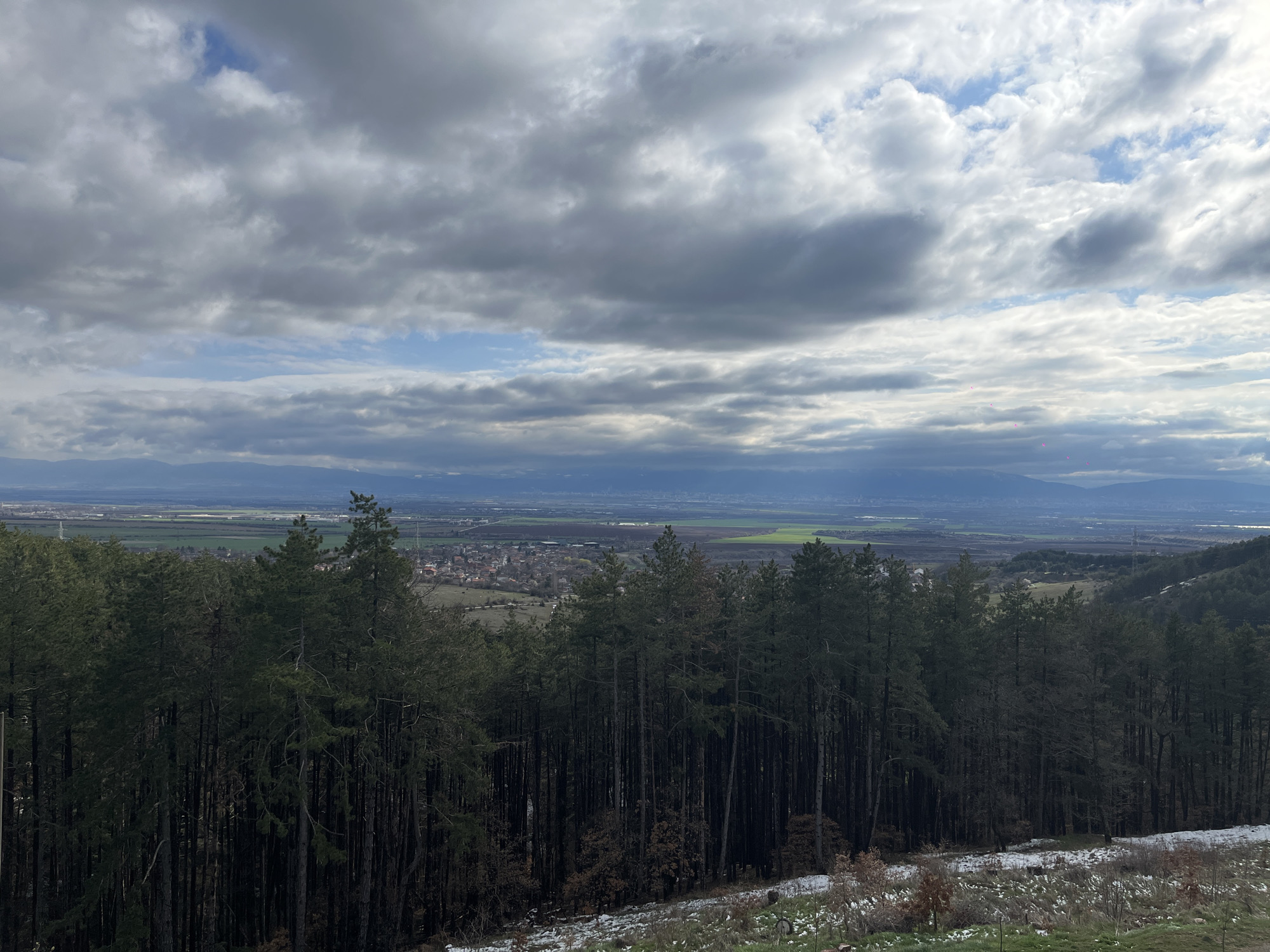 The image presents a panoramic elevated landscape view, likely from the slopes of Vitosha Mountain or a similar high point overlooking the Sofia Plain in Bulgaria. The lower half of the frame is dominated by a dense, dark coniferous forest composed of numerous slender pine trees. Patches of snow are visible on the sparsely vegetated ground at the bottom right, indicating cold weather conditions. Beyond the treeline, a small residential settlement with numerous buildings, many featuring reddish-brown roofs, is visible in the midground. Further into the distance, agricultural fields, some green and some fallow, extend across a broad plain. A tall, lattice-structure electrical transmission tower stands prominently on the far right midground. The background features a faint, hazy blue mountain range on the horizon. The sky is predominantly overcast, filled with various shades of grey stratocumulus and cumulus clouds, though small sections of bright blue sky are visible, particularly towards the center and right. No individuals, animals, or explicit actions are depicted.