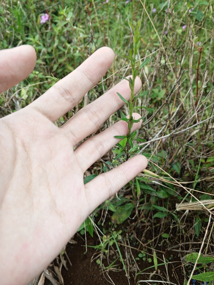 A close-up, ground-level image depicts a light-skinned left hand positioned horizontally in the foreground, palm facing the viewer, with fingers extended to the right. Immediately adjacent to the ring and pinky fingers is a slender, upright green plant with numerous small, narrow leaves. The surrounding environment consists of dense, uncultivated vegetation, including various green plants, dried brown stalks, and scattered small purple flowers. Dark brown soil is visible at the very bottom of the frame. The scene is an outdoor, natural area in the city of Unknown, Unknown.