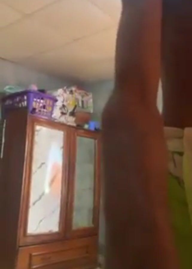 A shirtless man in a green and yellow towel stands in a room, holding a long, thin bow and arrow. The room has a wooden cabinet with mirrors and a plastic basket on top. The walls are painted gray, and a bright light shines from the ceiling. The man aims the bow and arrow toward the camera before the video ends.