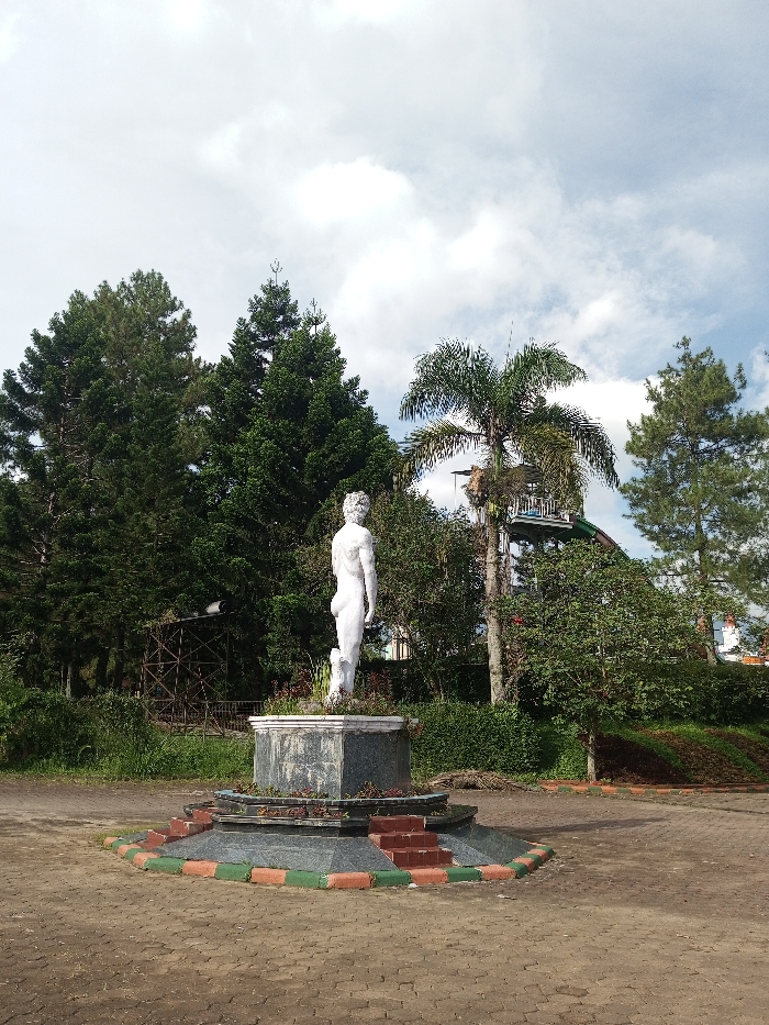 A white statue of a nude male figure stands on a multi-tiered gray and brick base in a brick-paved area. Lush green trees surround the statue, including tall evergreens and a palm tree. Behind the statue and trees, a multi-story building with an observation tower is partially visible. The sky is cloudy, suggesting a cool, overcast day. The area appears to be a well-maintained garden or park setting.