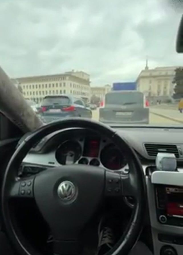 From the driver's seat of a Volkswagen, the video captures a view of a city scene under a cloudy sky. Buildings are visible in the distance across a busy street. The car’s interior is typical, with a dashboard featuring gauges, a radio, and an air freshener. Other vehicles are in view, including a dark van directly ahead. The driver’s hands are visible on the steering wheel. The overall impression is of being inside a car waiting in city traffic.