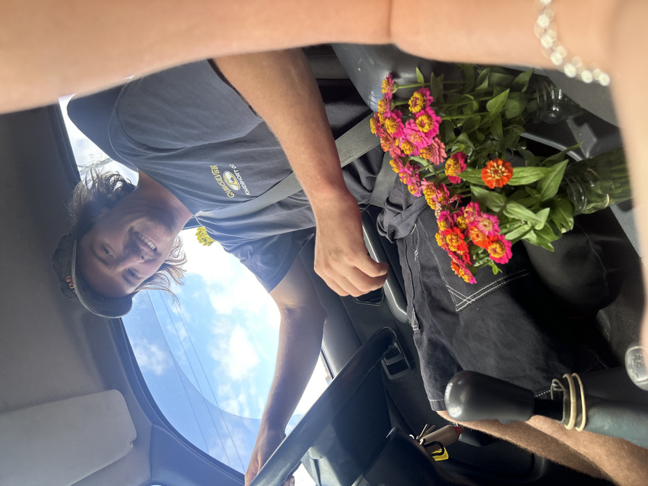 A man wearing a hat and a Quiksilver t-shirt smiles from the driver's seat of a car. He has on his seatbelt and is seen from a low angle, partially obscured by the car's interior. A vibrant bouquet of orange and pink zinnias rests on the passenger seat, nestled within glass jars. The sky is visible through the car windows.