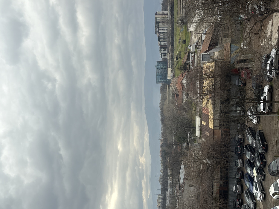 The image presents an urban panoramic view in Plovdiv, Bulgaria, under a uniformly overcast sky. In the foreground, a large unpaved parking area occupies the lower portion, containing approximately 40-50 parked vehicles of various types including sedans, SUVs, and station wagons, predominantly in dark or silver tones. The ground in the parking area appears dark and somewhat muddy. Surrounding and interspersed among the parking areas are numerous bare deciduous trees, their intricate branch structures visible without foliage. Behind the immediate foreground parking, a series of older, low-rise industrial or commercial buildings are visible, characterized by varied roofing materials including corrugated metal and red tiles, some showing signs of weathering. The midground continues this pattern of older structures and bare trees, transitioning into broader expanses of undeveloped land or fields with patches of green grass and dirt tracks. In the background, the urban landscape evolves to include modern developments. A prominent multi-story building with a reflective blue glass facade is visible on the right, alongside a cluster of several multi-story, light-colored residential or commercial buildings. Further to the left, construction activity is indicated by the presence of multiple tower cranes rising above other distant buildings. The furthest background is dominated by a range of hazy mountains, their outlines softened by atmospheric conditions and blending into the heavy, gray cloud cover that extends across the entire sky. No individuals, specific actions, or interactions are discernible within the scene. The overall environment suggests an urban district of Plovdiv, likely a periphery or redeveloping area, characterized by a mix of established industrial zones, new construction, and natural mountainous terrain.