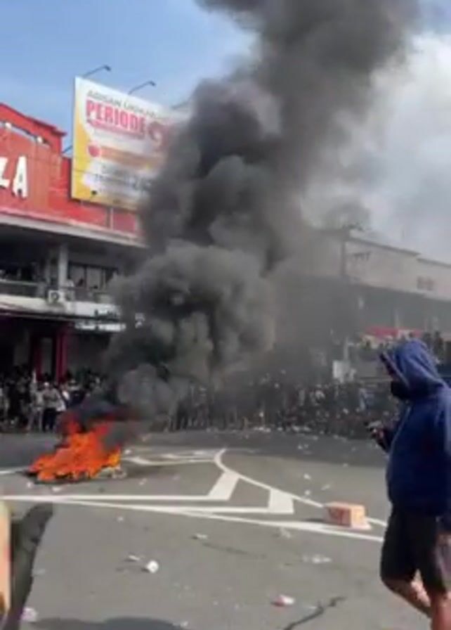 scene of civil unrest. A large fire burns in the middle of an intersection, sending up a thick plume of black smoke. A crowd of people is gathered around the fire, some are on the balcony of a building. Debris litters the street. In the foreground, a person walks across the intersection. The sky is mostly clear, with a few clouds visible. A large sign on a building reads "PLAZA" and displays some information in what appears to be Indonesian.