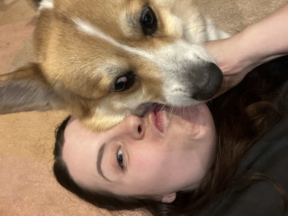 A woman lies on her back, her face angled towards the camera, with her lips puckered as if for a kiss. A corgi dog is positioned directly above her, its snout and mouth near her face, appearing to playfully "bite" her cheek or nose. The dog is tan and white, while the woman has fair skin and dark hair. The background is a neutral tone, suggesting a floor or carpet. Her arm is over the dog.