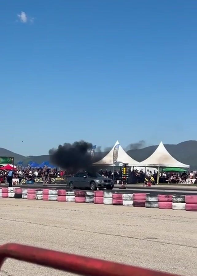 drag race featuring two cars at a racetrack. A gray sedan crosses the starting line on the left side of the frame, leaving the other car behind in a cloud of dark smoke. The sedan races down the track, passing by stacks of tires. Spectators line the track, gathered under tents and canopies, and a mountainous landscape is visible in the distance. The sky is clear and blue. A red safety railing is in the foreground. The car's livery includes the name "Pipiwi Garage".