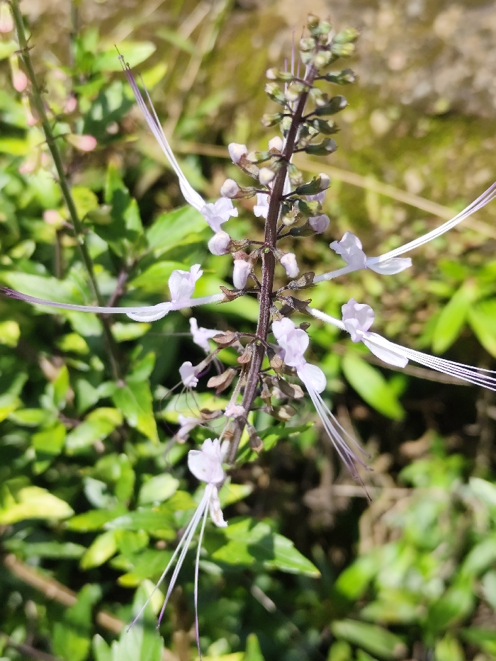 A close-up photograph displays a flowering plant stem centrally positioned and extending vertically through the frame. The primary subject is a dark reddish-brown stem, approximately 0.5 cm in diameter, bearing multiple small, delicate flowers. These flowers, light lavender to white in color, are arranged in whorls along the stem. Each open flower features several prominent, slender, white to pale purple whisker-like stamens or styles, measuring up to 2 cm in length, projecting outwards radially. Unopened floral buds, light green with subtle purple tips, are visible towards the upper section of the stem. Green, ovate leaves with visible venation and serrated edges are present on the plant and as out-of-focus elements in the immediate foreground and background. The background is composed of heavily blurred green foliage, indicating a natural, vegetated outdoor setting. Bright, natural light illuminates the scene, casting soft highlights on the flowers and leaves. No human figures, animals, or man-made objects are visible. The image contains no discernable landmarks, architectural features, or specific environmental details to visually confirm its location within the city of Charleroi, Belgium.