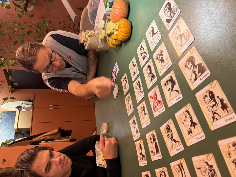 Two males are present in an indoor setting in Boreti, Montenegro. They are seated at a green rectangular table, engaged in what appears to be a card game. The male on the left, a young adult with dark hair, wears a dark long-sleeved shirt. His left hand is positioned near a silver foil container and a small clear plastic cup containing a white substance. The male on the right, an adult with lighter hair, wearing glasses and a grey short-sleeved shirt with a black panel and red Nike logo, has visible tattoos on his right forearm. He is leaning forward, his right hand extended and positioned above several cards, indicating an action in the game. Numerous rectangular playing cards are fanned out across the table, arranged in rows. Each card features a sepia-toned illustration of a person's face and a name in Cyrillic script. One card, labeled "Горацио," displays a red 'X' mark. Near the right male, multiple food containers are stacked, including cylindrical containers wrapped in plastic, smaller clear plastic cups with various dips, and a container of croutons. Three small orange and yellow pumpkins or gourds are placed decoratively beside the food items. The background consists of an orange-red colored wall. A brown two-door cabinet is visible on the left, topped with a black desk lamp, a cardboard box, and a framed blue artwork. A brown coat or jacket hangs near the cabinet. A green trailing plant is draped along the upper section of the wall, extending towards the right side of the frame. A beige upholstered chair back is partially visible on the far right.
