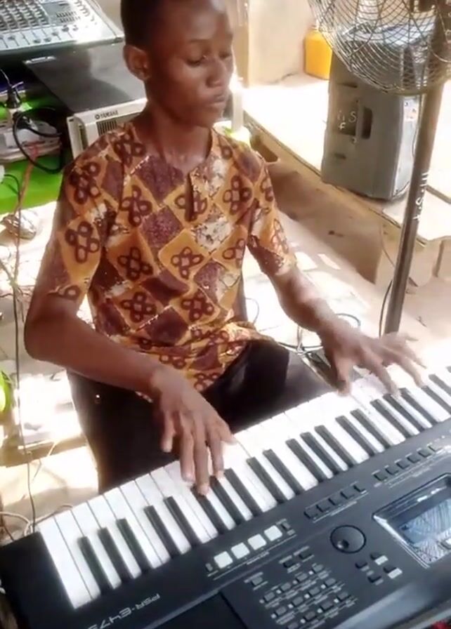A young man is playing an electronic keyboard, while seated in a chair