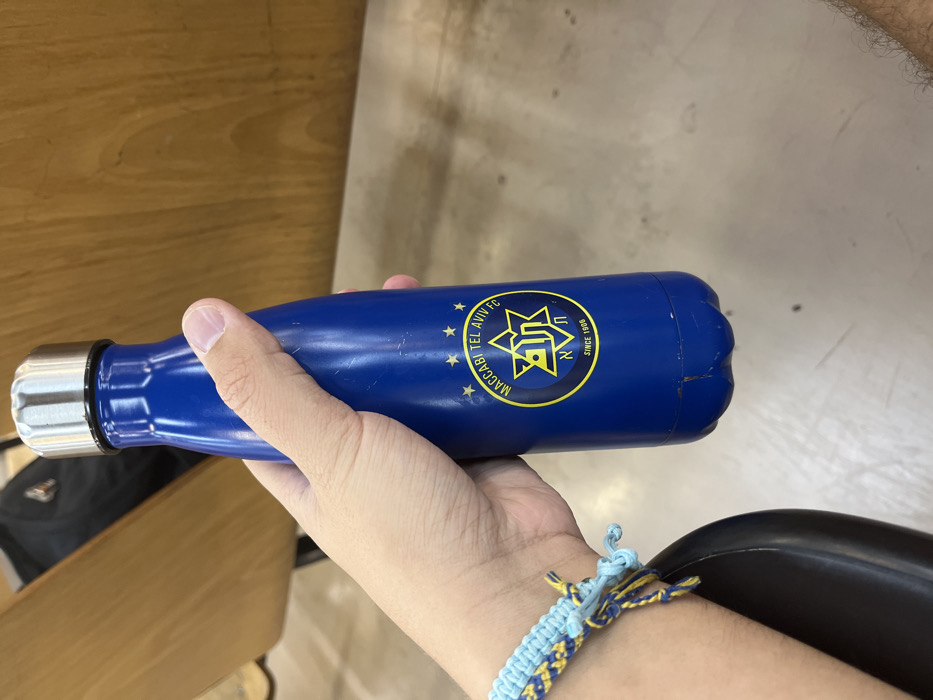 A first-person perspective image depicts a hand holding a blue insulated water bottle indoors. The scene is located in Givat Shmuel, Israel, within an environment consistent with an academic institution or public facility, evidenced by the visible wooden furniture. **Details:** * **People:** A light-skinned individual's right hand and forearm are visible, actively holding the bottle. The hand shows no distinguishing marks beyond common skin texture, and fingernails are short and clean. A multi-strand braided friendship bracelet in light blue and yellow colors is worn on the wrist. * **Objects:** The primary object is a cylindrical, dark blue metal water bottle with a silver/stainless steel screw-top cap. The bottle's surface exhibits wear, including multiple scuff marks and several small dents, notably near its base. A circular yellow and black logo is prominently displayed on the bottle, featuring five yellow stars arranged in an arc above the text "MACCABI TEL AVIV FC." Below this is a stylized Star of David containing the Hebrew letters "ת"א" (TA) and the text "SINCE 1906" at the bottom edge of the circle. * **Environment:** The background features light-brown wooden surfaces, consistent with desks or the backs of chairs found in a classroom or lecture hall setting. A dark object, possibly a backpack, is partially visible in the upper left background. The floor beneath the individual's arm and the bottle is a light grey or beige color, appearing to be concrete or linoleum, with some minor surface inconsistencies. * **Actions/Interactions:** The visible hand is firmly gripping the water bottle.
