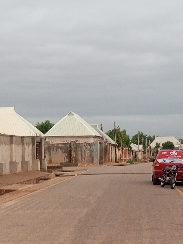 The image displays a street scene within Birnin Kebbi, Nigeria, under an overcast sky