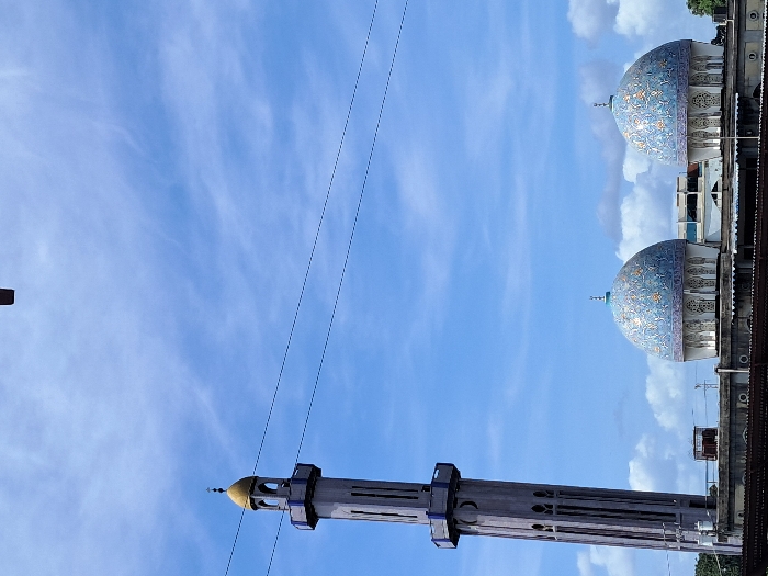 A low-angle shot captures a mosque against a vibrant blue sky scattered with wispy clouds. Two intricately tiled domes with metallic accents sit atop a building, partially obscured by structures. Adjacent, a tall, slender minaret rises, crowned with a golden dome. Electrical wires traverse the sky, adding a modern element to the traditional architecture.