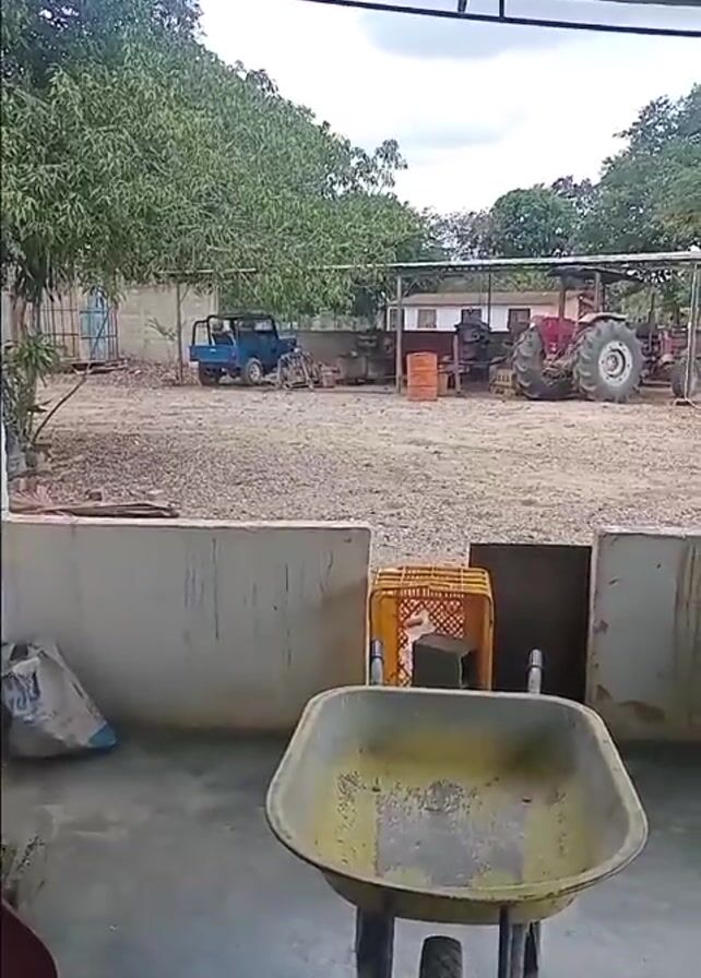 n outdoor space, possibly a farm or rural area, with a tractor and other equipment visible in the background