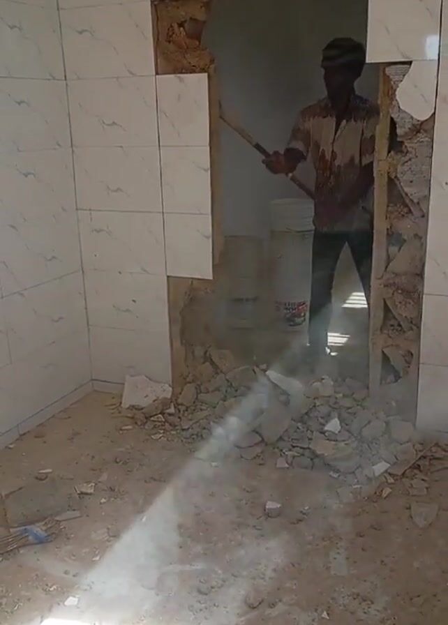A man is demolishing a tiled wall with a sledgehammer. He's standing in a doorway between two rooms, with a pile of rubble on the floor. The room he's standing in has three stacked buckets. The room the camera is in has tiled walls and a dusty floor. There is a brush on the floor. The dust from the demolition is filling the air.