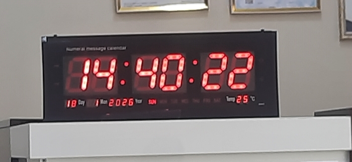 - "An interior static image depicts a black rectangular "Numeral message Calendar" digital display unit, showing red LED segment text" by FM-0zE9q2, licensed under CC BY 4.0