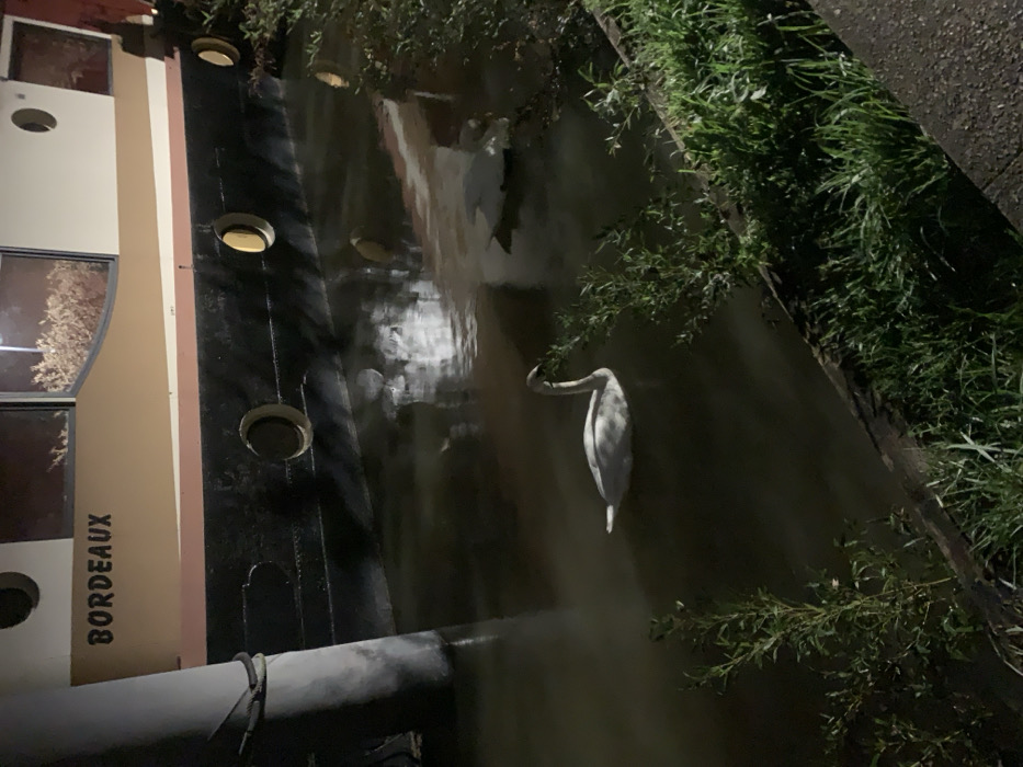 The scene depicts a nocturnal view of a waterway in Issy-les-Moulineaux, France. A vessel, identified as a barge or houseboat, is moored on the left side of the frame, secured to a light-colored vertical mooring post with a thick rope. The vessel's hull below the waterline is submerged in dark, reflective water. Its visible structure consists of a lower black section featuring three distinct circular portholes, and an upper, lighter-colored section, possibly beige, which prominently displays the name "BORDEAUX" in black capital letters. Rectangular windows on the upper section reflect ambient light and contain what appears to be dry plant material. Two white swans are present in the murky water. One swan is positioned in the foreground, oriented towards the left, with its neck extended upwards. A second swan is partially visible further back and to the right, closer to the bank. The right bank of the waterway is characterized by dense green foliage, including grass and small shrubs, extending into the water. A dark, level surface, consistent with a paved edge or walkway, borders the foliage at the bottom right of the image. Ambient light sources, not visible within the frame, illuminate the scene, casting reflections on the water's surface.