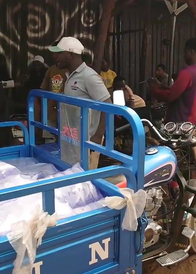 bright blue three-wheeled motorcycle truck loaded with sealed bags of water, likely for sale. Several men are standing around it, some seemingly inspecting the merchandise or engaged in conversation. One man, wearing a white hat, is particularly focused on the load. The setting appears to be an outdoor market or roadside area, with a somewhat dilapidated building structure in the background. The atmosphere appears social and commercial.