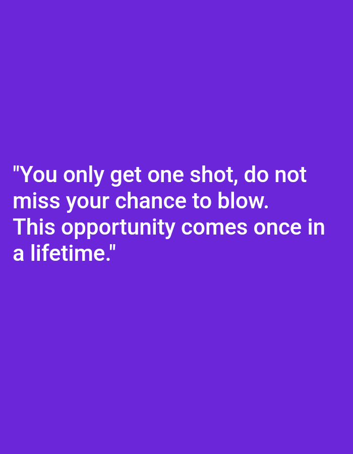 The image displays white text on a solid, uniform purple background. The text, presented in a sans-serif font and enclosed in double quotation marks, is positioned in the lower-central portion of the frame. It reads: "You only get one shot, do not miss your chance to blow. This opportunity comes once in a lifetime." No individuals, specific objects, actions, or complex environmental features are depicted. The scene consists solely of this textual content against a plain color field. The location is the city of Парэчча, Belarus.