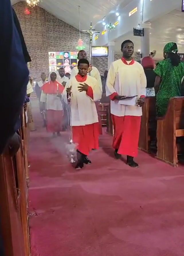 religious procession moving through a church aisle. A young man is swinging a censer, emitting a trail of smoke as he walks forward. He is dressed in a white robe with red accents. Following him are other individuals, including a person holding a candle and a religious figure wearing a dark robe with a white collar. The church's interior includes wooden pews, red carpeting, and various light fixtures. A crucifix is visible at the end of the aisle. The atmosphere appears solemn and ceremonial.