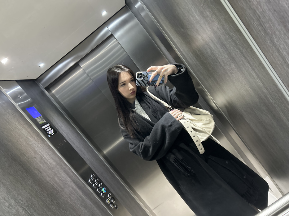 An individual is depicted in a mirror selfie taken inside a brushed stainless steel elevator in Cachan, France. The subject, a female with long dark hair, wears a long, dark-colored coat over a white collared shirt and carries a light-colored, studded shoulder bag. She holds a smartphone with a blue and white striped case in her left hand, which is visible in the reflection, to capture the image. Her left hand displays dark nail polish and rings. The elevator interior features a control panel on the left wall with illuminated circular buttons and a digital display showing blue graphics. White ceiling panels with recessed lighting are visible above the reflective surfaces.