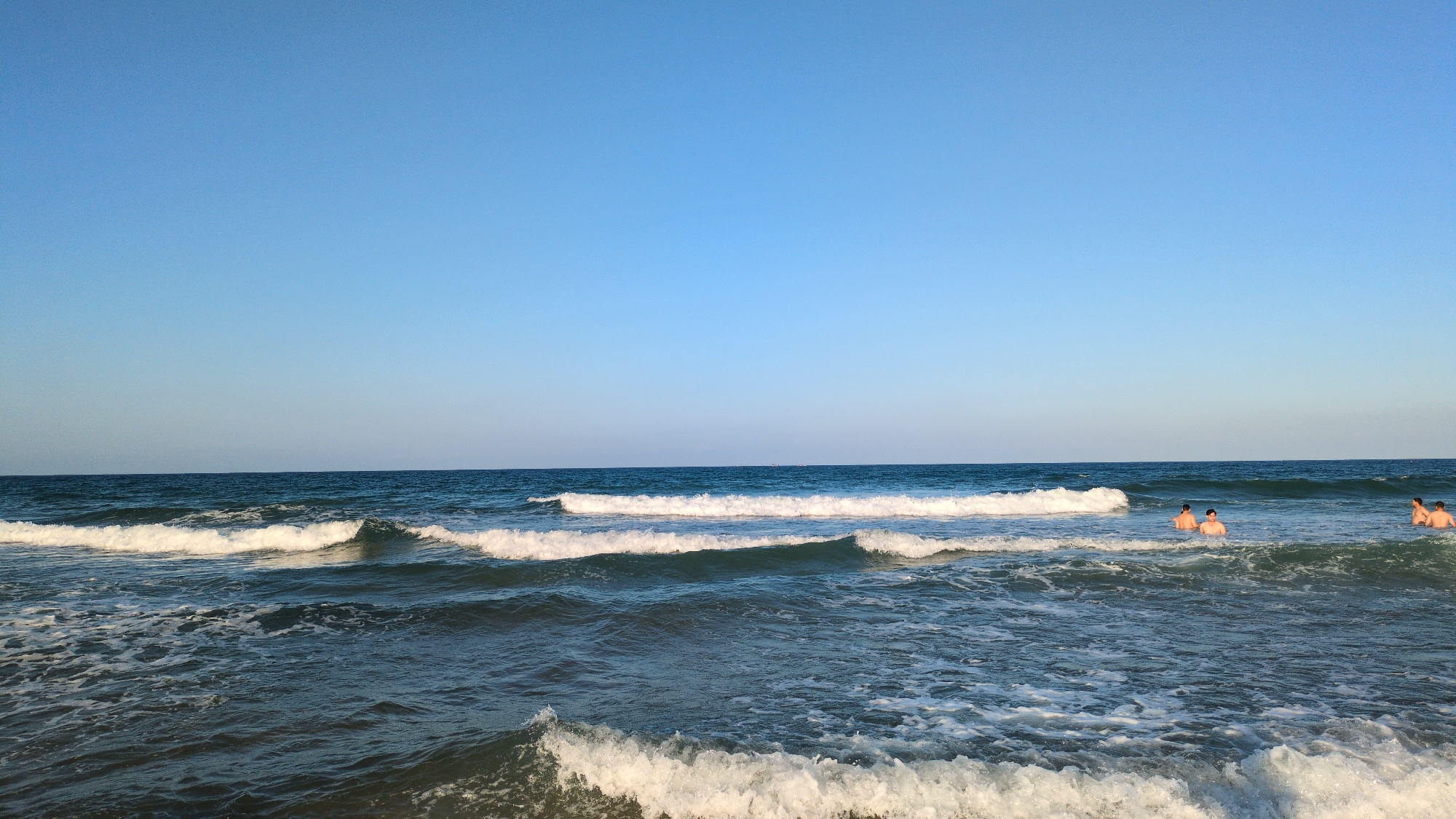 The image displays an ocean scene at a beach in Tuy Hòa, Vietnam, under a clear, light blue sky. Approximately two-fifths of the frame is occupied by the sky, with the remaining three-fifths depicting the ocean. The water is a dark blue-green, characterized by multiple breaking waves with white crests and foam, particularly prominent in the foreground and mid-distance. Three individuals are observed partially submerged in the ocean, with their heads and torsos visible above the water. Two individuals are grouped together slightly left of the image center, while a third is positioned further right. All three appear to be adult males, shirtless, facing generally away from the camera or towards the right, and are actively engaged with the waves. The scene suggests a daytime setting with calm conditions beyond the immediate breaking surf.
