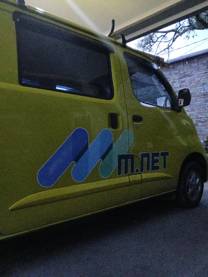 A bright yellow compact van is parked on a dark paved surface in Bandung City, Indonesia, likely under a structural overhang or carport. The left side of the van, displaying two tinted windows and a side mirror, is visible from a low angle. Two black roof rack bars are mounted on the vehicle's roof. The van's yellow exterior features a prominent logo: three parallel, wave-like, elongated oval shapes (dark blue, light blue, and green, from left to right) followed by the dark blue text "M.NET". In the background, a light-colored stone-clad wall is visible, with tree branches silhouetted against a dimly lit sky above it. No individuals are present in the scene.